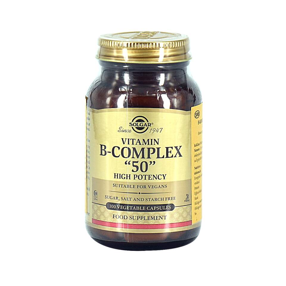 Solgar vitamin B 50 sadrži sve vitamine B grupe u dozama od 50 mg ili 50 µg. Najveću efikasnost pokazuju kada su zajedno. Imaju ulogu u raznim procesima u organizmu. B1 doprinosi normalnoj funkciji nervnog sistema. B2 učestvuje u metabolizmu. B3 se koristi kao potpora terapiji srca i krvnih sudova i povišenog nivoa masti. B6 je neophodan za stvaranje crvenih krvnih ćelija, jačanje imuniteta. Najvažnija mu je funkcija učestvovanje u stvaranju hemoglobina i održavanju ravnoteže natrijuma i kalijuma. B12 učestvuje u stvaranju proteina, u metabolizmu masti i ugljenih hidrata. Njegov nedostatak uzrokuje pernicioznu anemiju, poremećaje u nervnom sistemu, umor, razdražljivost, gubitak apetita, dijareju, može uzrokovati poremećaj menstruacije i utrnulost u rukama i nogama. Folna kiselina je važna za razvoj nervnog sistema.