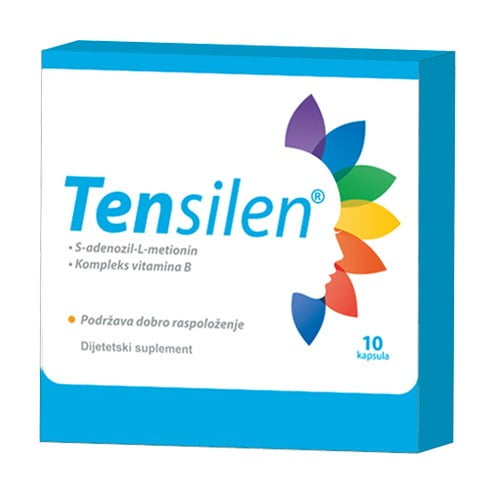 Popravlja raspoloženje Pomaže vraćanje volje Smanjuje osećaj strepnje Smanjuje osećaj nesigurnosti 30 godina u Evropi Potpuno prirodan Ne izaziva zavisnost Tensilen® u svojm sastavu sadrži ’’SAM-e’’, amino-kiselinu koja se prirodno nalazi u svakoj ćeliji u ljudskom telu. Ukratko, SAMe je supstanca u vašem telu koji služi kao gorivo za mnoge važne funkcije – uključujući održavanje prirodnog, dobrog raspoloženja. Puno ime ove amino-kiseline je S-adenozil L-metionin. Otkriven je u Italiji 1952, pa ne iznenađuje činjenica da je do danas, većina istraživanja sprovedena upravo u zemlji njegovog otkrića. Više od 30 godina evropski lekari su prepisivali SAM-e za vraćanje raspoloženja. Zbog brojnih studija i iskustava ljudi koji su ga koristili smatra se jednim od najsigurnijih i najefikasnijih prirodnih lekova za depresiju. Iako određena doza ove supstance već postoji u našem organizmu, način ishrane, stres, proces starenja, nedostatak vitamina i drugi faktori mogu uticati na količinu koju naše telo proizvodi. Istraživanja su pokazala da kada se osećamo loše, u organizmu imamo manje ove amino-kiseline nego što je to potrebno. Studije su potvrdile da dodatni unos poboljšava raspoloženje, promovišući balans neurotransmitera koji su odgovorni za zdravo funkcionisanje ćelija nervnog sistema. Dodatni unos se preporčuje jer podstiče produkciju serotonina i drugih supstanci odgovornih za za popravljanje raspoloženja. Pakovanje: 10 kapsula