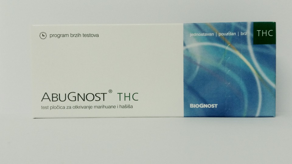 Test Abugnost – THC za otkrivanje marihuane i hašiša u mokraći Delovanje: Laboratorijska test pločica je brz jednostepen test za otkrivanje sastojaka marihuane i hašiša (tetrahidrokanabinola) u mokraći. Tetrahidrokanabinol ili skraćeno THC je glavni satojak marihuane i hašiša. Obe droge se dobijaju iz indijske konoplje, s tim da marihuanu čine sušeni delovi stabljike a hašiš je smolasti produkt prerade marihuane. Kada se puši, marihuana izaziva osećaj euforije 20-30 minuta od početka pušenja, a dejstvo jedne cigarete marihuane iznosi između 90-120 minuta. Konzumenti imaju prolazne smetnje pamćenja i oslabljenu koncentraciju. Takođe, mogu imati prolaznu konfuziju i anksioznost. dugotrajno uživanje marihuane može uzrokovati smetnje u ponašsanju. Sastojci marihuane otkrivaju se u mokraći već posle 1-2 sata od pušenja, a ostaju prisutni i posle 3 do 10 dana. Abugnost THC test otkriva sastojke marihuane i hašiša prisutne u uzorku mokraće u koncentraciji od 50 ng/ml. Ukoliko je test pozitivan (jedna linija na pločici), potrebno je rezultat potvrditi dodatnim, preciznijim testom. Ako je rezultat negativan (dve linije na pločici), smatra se da određena droga trenutno nije prisutna u organizmu i rezultat nije potrebno potvrđivati. Način primene: Testira se samo svež i bistar uzorak mokraće prikupljen u čistu i suvu posudu. Pre početka izvođenja postupka i otvaranja zaštitne folije potrebno je pažljivo pročitati uputstvo za testiranje,u potpunosti. Ukloniti zaštitnu foliju, potom položiti Abugnost test pločicu na čistu i vodoravnu podlogu. Priloženom kapaljkom preneti uzorak mokraće iz posude i držeći kapaljku uspravno, polako ukapati tri kapi u otvor za uzorak označen slovom S. Paziti da se u kapima urina ne nalaze mehurići vazduha. Ostaviti pločicu u istom položajui očitati rezultat testiranja posle tačno 5 minuta. Pozitivan rezultat: Jedna crveno obojena linija u području kontrole C Negativan rezultat: Formiranje dve crveno obojene linije u poručju testa T. Intenzitet obojenja linije u području testa T može da varira od bledo ružičaste do crvene, ali bez obzira na intenzitet rezultat se smatra negativnim. Nevažeći rezultat: Izostanak formiranja linije u području kontrole C po isteku 5 minuta, bez obzira da li je formirana linija u području testa ili nije. Pakovanje: 1 test Test THC je medicinsko sredstvo, i prodaja putem interneta i/ili pošte nije dozvoljena. Možete ga pronaći u našim apotekama. Za više informacija obratite se na kontakt telefon.