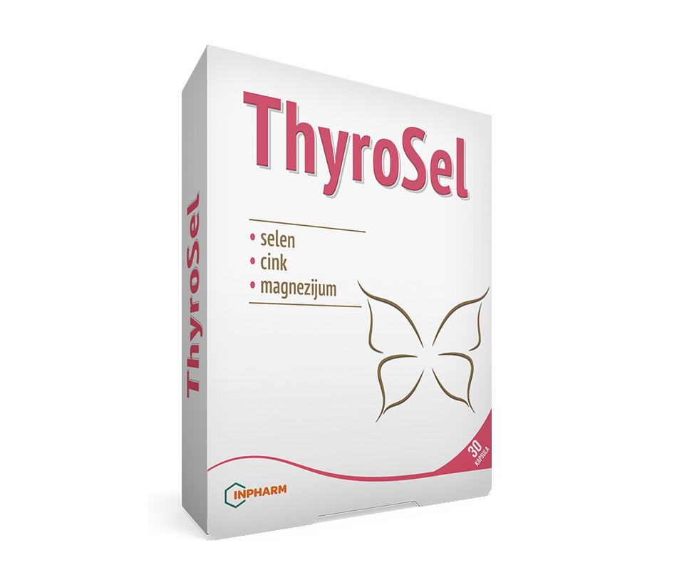 THYROSEL 30 KAPSULA ThyroSel kapsule sadrže kombinaciju selena, magnezijuma i cinka i namenjene su osobama koje imaju tiroidnu bolest. Karakteristika autoimunih tiroidnih bolesti, kao što je Hashimoto thyreoiditis je povećanje oksidativnog stresa i poremećaj imunog sistema. Kod osoba sa polinodoznom strumom prisutno je povećanje oksidativnog stresa u štitastoj žlezdi. Kombinacija selena, magnezijuma i cinka je korisna i kod autoimunih tiroidnih bolesti i kod polinodozne strume. Opservaciona i randomizovana kontrolisana istraživanja su pokazala da selen može da smanji koncentraciju TPO-antitela, učestalost hipotireoze i postporođajnog tiroiditisa. Selen doprinosi normalnoj funkciji štitaste žlezde i zajedno sa cinkom doprinosi zaštiti ćelija od oksidativnog stresa i normalnom funkcionisanju imunog sistema. Magnezijum doprinosi smanjenju umora i doprinosi normalnom balansu elektrolita. ThyroSel kapsule se preporučuju za: optimalnu tiroidnu funkciju očuvanje tiroidne funkcije obolelih od Hashimoto thyreoiditis-a smanjenje koncentracije antitiroidnih antitela kod obolelih od Hashimoto thyreoiditis-a odlaganje nastanka hipotireoze Način upotrebe: Jedna do dve kapsule dnevno. Kapsule popiti sa punom čašom vode, tokom ili posle obroka. Pakovanje: 30 kapsula Zemlja porekla: Srbija