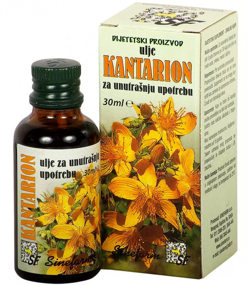 DIJETETSKI SUPLEMENT – ORALNE KAPI Način upotrebe: Za navedena stanja popiti 3 puta dnevno po 30 kapi pre jela sa malo vode, mleka, meda i slično. Napomene: Pre upotrebe promućkati. Preporučena dnevna doza se ne sme prekoračiti. Suplementi se ne mogu koristiti kao zamena za raznovrsnu ishranu. Čuvati van domašaja dece. Upozorenje: Kapi ne treba da koriste osobe preosetljive na bilo koji sastojak. Sadrže malu količinu alkohola u tragovima. Nisu namenjene trudnicama, dojiljama i mlađima od 18 godina. Tokom uzimanja ovog proizvoda ne preporučuje se izlaganje suncu i UV zracima. Način čuvanja: Proizvod čuvati zatvoren u originalnom pakovanju, zaštićen od svetlosti i vlage, na temperaturi do 25°C. Sastav: Uljani ekstrakt herbe kantariona 1:4 (Hypericum perforatum). Energetska vrednost 3240 kJ/771 kcal na 100 ml. Osobine i delovanje: U cvetovima kantariona nalaze se bojene materije: do 0,4% hipericina, flavonoida, do 0,3% etarskog ulja sa terpenima, i do 10% tanina. Herba (cvet sa stabljikom) sadrži i do 3% hiperforina, materije sa antibiotskim delovanjem. Kantarion ima antiseptično, antiupalno, sedativno, analgetičko i antioksidantno dejstvo. Povoljno deluje kod lakših oblika neurotičnih depresija (npr. klimakterične tegobe, nesanica, razdražljivost, nemir). Može se koristiti kod tegoba digestivnog trakta (čira na želudcu i dvanaestercu, katara creva i sl.). U narodnoj medicini koristi se kao antidijaroik (protiv proliva), diuretik, kod reumatizma, gihta, a u stomatologiji kod upalnih procesa u ustima (gingivit, stomatit i sl.). Ulje od kantariona je obogaćeno vitaminom E.