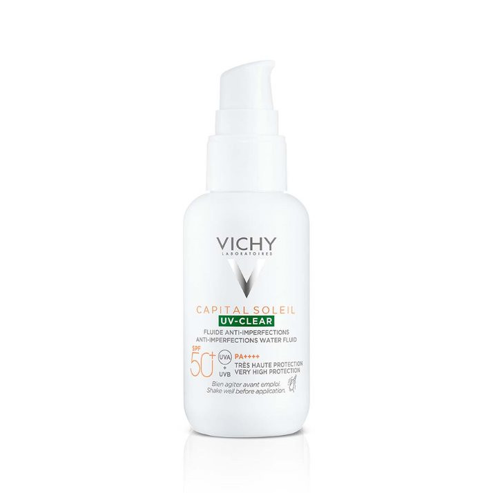VICHY CAPITAL SOLEIL UV-CLEAR Fluid za zaštitu od sunca protiv nepravilnosti SPF50+, 40 ml Veoma visoka zaštita od sunca za lice. UVB+ UVA. Koža sklona aknama. Fleke. Prekomerno lučenje sebuma. Ne ostavlja masan trag. NEKOMEDOGENA. Salicilna kiselina. Niacinamid. Ispitano pod oftalmološkom nadzorom. Sastav: AQUA /WATER, ALCOHOL DENAT., DIISOPROPYL SEBACATE, SILICA, ISOPROPYL MYRISTATE, ETHYLHEXYL SALICYLATE, ETHYLHEXYL TRIAZONE, BIS-ETHYLHEXYLOXYPHENOL METHOXYPHENYL TRIAZINE, BUTYL METHOXYDIBENZOYLMETHANE, GLYCERIN, CI 77891 / TITANIUM DIOXIDE, PROPANEDIOL, C12-22, ALKYL ACRYLATE/HYDROXYETHYLACRYLATE COPOLYMER, NIACINAMIDE, DROMETRIZOLE TRISILOXANE, PERLITE, TOCOPHEROL, CAPRYLIC/CAPRIC TRIGLYCERIDE, TEREPHTHALYLIDENE DICAMPHOR SULFONIC ACID, CI 77492 / IRON OXIDES, CAPRYLYL GLYCOL, PENTYLENE, GLYCOL, TRIETHANOLAMINE, HYDROLYZED RICE PROTEIN, CI 77491 / IRON OXIDES, TRISODIUM ETHYLENEDIAMINE, DISUCCINATE, SILICA SILYLATE, ACRYLATES / C10-30, ALKYL ACRYLATE CROSSPOLYMER, BUTYLENE GLYCOL, CI 77499 / IRON OXIDES, HYDROXYETHYLCELLULOSE, VITREOSCILLA FERMENT, DISODIUM EDTA, PARFUM / – FRAGRANCE Način upotrebe: Nanesite proizvod svakog jutra nakon dnevne nege kože. Dobro promućkajte pre nanošenja. Nanosite često i obilno kako biste održali zaštitu. Ne pruža 100%-tnu zaštitu od sunca. Prekomerno izlaganje suncu je opasno. Ne izlažite bebe i malu decu direktnom sunčevom zračenju.