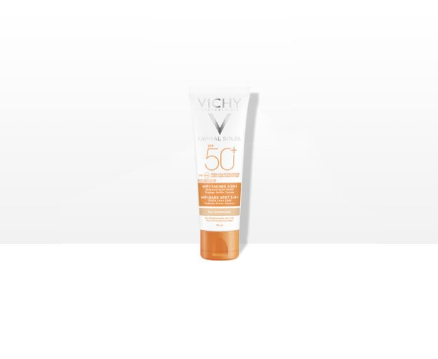 VICHY IDEAL SOLEIL Obojena zaštitna krema 3 u 1 SPF 50+ protiv tamnih fleka Obojena zaštitna krema 3 u 1 protiv tamnih fleka. Nemasni efekat. Vrlo visoka zaštita. Efikasnost Trenutno ujednačava ten zahvaljujući univerzalnim mineralnim pigmentima. Iz dana u dan koriguje fleke svojom pigmentisanom / obojenom formulom obogaćenom glavnim aktivnim sastojkom protiv fleka (Phe-Resorcinol) i štiti od UVB/UVA zraka. Dokazana klinička efikasnost. 19.2% fleka je ublaženo posle 8 nedelja upotrebe. Pojačana zaštita i od UVA zraka. Primena Nanesite prozvod neposredno pre izlaganja suncu, ponovno ga nanosite često i bogato, posebno posle plivanja, znojenja ili brisanja peškirom. Izbegavajte područje oko očiju. U slučaju kontakta s očima odmah ih temeljno isperite. Izbegavajte dodir sa tkaninom. Sigurnost Njena hipoalergena formula BEZ PARABENA ispitana je na osetljivoj koži pod dermatološkim nadzorom. Obogaćena je termalnom vodom Vichy koja smiruje, jača i obnavlja kožu.