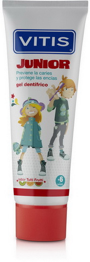VITIS JUNIOR GEL PASTA ZA ZUBE 6+ 75ML Za svakodnevnu oralnu higijenu. Prevencija karijesa i zaštita dečijih zuba i desni. Njegova formula pruža neophodnu dentalnu higijenu od pojave prvih zuba. Natrijum fluorid pojačava zubnu gleđ i štiti zube od karijesa. Ksilitol osvežava usta. Ne može oštetiti zube zbog niske abrazivnosti. Blagi tuti fruti ukus čini pranje zuba prijatnom aktivnošću. NE GUTATI! Način upotrebe: Preporučljivo za decu 6+ godina prati zube 2 puta dnevno, ili nakon obroka. Sastav: sorbitol, voda, silika, glicerin, ksilitol, natrijum benzoat, pantenol, kokamidopropil betain, karboksimetil celuloza,PEG-40 hidrogenizovano ricinusovo ulje, natrijum lauril sarkozinat, natrijum fluorid, natrijum saharin, benzoeva kis., limunska kis., titan dioksid, tetra natrijum natrijum EDTA methilparaben, aroma, CI 16035 Zemlja porekla: Španija