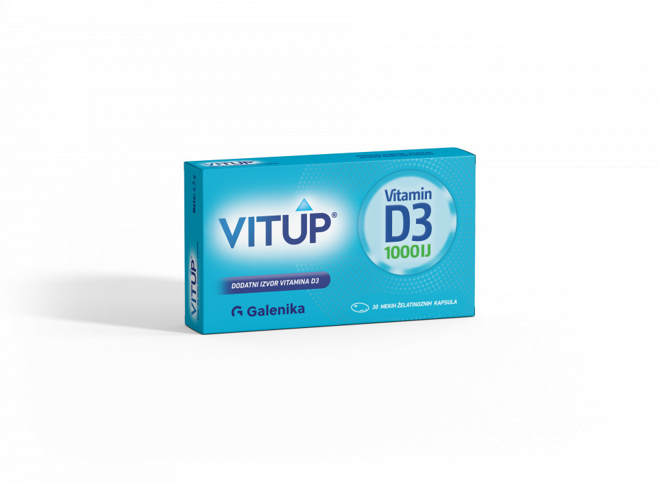 Vitup® D3 1000 IJ, kapsule je hrana za posebne medicinske namene sa vitaminom D3, namenjena za potrebe ishrane kod osoba sa hipovitaminozom vitamina D, kod osoba sa oslabljenim i poremećenim imunitetom, kod osoba sa osteopenijom, osteomalacijom, osteoporozom, kod osoba iznad 65 godina starosti u cilju prevencije preloma kostiju, kod osoba sa dijabetesom, sa autoimunim, kardiovaskularnim i malignim stanjima i kod osoba sa ostalim poremećajima i stanjima kod kojih je neophodna nadoknada vitamina D3. Sadržaj aktivnih komponenti 1 kapsula % NRV* 100 g Vitamin D3 (holekalciferol) 25,0 µg 500 16,7 mg *NRV – nutritivna referentna vrednost Sastojci : rafinisano suncokretovo ulje, goveđi želatin, glicerol, holekalciferol, prečišćena voda Nutritivne informacije: 1 kapsula 100 g Energetska vrednost (kJ / kcal) 4,1 / 1,0 2.759,2 / 665,9 Masti – ukupno (g) 0,09 56,70 od toga zasićene masne kiseline (g) 0,01 8,36 Ugljeni hidrati – ukupno (g) 0,02 14,06 od toga šećeri (g) 0,00 0,04 Proteini (g) 0,04 24,86 So (g) 0,00 0,15 Način upotrebe: Odrasli: Popiti jednu kapsulu dnevno. Napomene: Proizvod je nutritivno nepotpuna namirnica i nije pogodan za upotrebu kao jedini izvor hrane za osobe kojima je namenjen. Čuvati van domašaja dece. Upozorenja: Preporučene dnevne doze se ne smeju prekoračiti. Proizvod ne treba da uzimaju osobe preosetljive na neki od sastojaka proizvoda. Proizvod nije namenjen mlađima od 18 godina, osobama sa hiperkalcemijom i hiperparatireoidizmom. Sastav proizvoda: Rafinisano suncokretovo ulje, goveđi želatin, glicerol, holekalciferol, prečišćena voda Pakovanje: 30 mekih želatinoznih kapsula