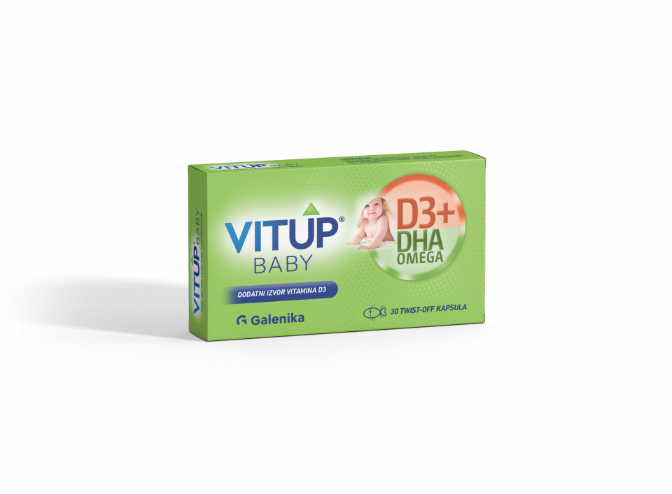 Vitup®D3+ DHA omega baby je dijetetski proizvod koja sadrži kombinaciju vitamina D3 i dokozaheksaenske kiseline (DHA) u optimalnoj dozi za upotrebu kod dece od 8. dana života do navršena 3 meseca za prevenciju stanja izazavanih nedostatkom ovih vitamina kod novorodjenčadi. Vitamin D3 i dokozaheksaenska kiselina (DHA) imaju značajne uloge u zdravom razvoju novorodjenčadi i dece, pa su i potencijalno ozbiljne posledice po zdravlje dece u slučaju njihovog nedostataka. Vitup®D3+ DHA omega baby obezbedjuje preporučenu dnevnu dozu vitamina D3 i DHA i na taj način pomaže u : – razvoju mozga, kognitivnih i mentalnih funkicja – razvoju vida i oštrini vida – normalnoj mineralizaciji kostiju, razvoju i rastu zuba i kostiju Sadržaj aktivnih komponenti 1 twist-off kapsula NRV* 100,0 g** Vitamin D3 (holekalciferol) 10,0 µg 100 4,0 mg Ulje mikroalgi Schizochytrium vrsta, od čega: – dokozaheksaenska kiselina (DHA) 250,5 mg 100,0 mg 100,0 g 39,8 g *NRV – nutritivna referentna vrednost ** odnosi se samo na sadržaj kapsule koji se konzumira Sastojci sadržaja kapsule : ulje iz mikroalgi Schizochytrium vrsta, holekalciferol. Sadržaj kapsule koji se ne konzumira: želatin, glicerol (humektant), crveni oksid gvožđa (boja), prečišćena voda. Dejstvo: Vitamin D3 je bitan za normalan rast i razvoj kostiju i zuba. Pripada grupi liposolubilnih vitamina. Sintetiše se prirodnim putem u koži, gde pod uticajem sunčeve svetlosti iz neaktivnog provitamina D prelazi u aktivni vitamin D3 . Zajedno sa paratiroidnim hormonom doprinosi normalnoj apsorpciji i poboljšava iskorišćavanje kalcijuma i fosfora iz digestivnog trakta, te ima ulogu u normalnoj mineralizaciji kostiju. Vitamin D3 učestvuje u procesu ćelijske deobe, kao i sintezi proteina i kontrakciji mišića, pa doprinosi normalnom funkcionisanju mišića. Usled nedostatka Vitamina D3 može doći do demineralizacije kostiju i oboljenja koje se naziva rahitis. Rahitis obuhvata grupu oboljenja kod kojih postoji poremećaj mineralizacije (ugradnje kalcijuma i fosfora) u hrskavicu i kosti koje rastu. Kao posledica se javlja bujanje hrskavičavog i koštanog tkiva, što stvara karakteristična zadebljanja na tipičnim mestima. Kosti ostaju meke i dolazi do razvoja krhkih i lomljivih kostiju. Kod svih novorođenčadi propisuje se primena vitamina D3 u dnevnoj dozi od 400 IJ (10 μg) od druge nedelje nakon rodjenja do prve godine. Od prve godine zivota do kraja puberteta preporučena je primena u zimskim mesecima. Dokozaheksaenska kiselina (DHA) DHA je dugolančana omega- 3 masna kiselina. DHA je važna strukturna komponenta mozga, nervnih ćelija i mrežnjače oka: 97% svih omega-3 masnih kiselina u mozgu čini DHA, a u retini je prisutna 93% od ukupnih omega-3 masnih kiselina. 60% strukture mozga čine masti , a 25% tih masti je upravo DHA. DHA, kao izuzetno važna strukturna komponenta mozga, čini 30 % strukturnih masti u sivoj masi mozga. Intenzivni rast mozga bebe se dešava u zadnjem trimestru trudnoće i prvih godinu dana života. U prve dve godine života DHA je esencijalna komponenta kritičnih vezivnih komponenata u mozgu Omega-3 masne kiseline su neophodne za razvoj mozga, kognitivnih , mentalnih funkcija i razvoj vida kod novorodjenčadi. DHA je važna strukturna komponenta nervnih ćelija mozga i mrežnjače oka. DHA koja se nalazi u proizvodu Vitup® D3 + DHA omega baby, twist-off kapsule je biljnog porekla – dobijena iz mikroalgi, čime je smanjen je rizik od zagađenja teškim metalima iz okeana, koji se nakupljaju u morskim životinjskim organizmima (ribama ili račićima). Nacin upotrebe : Odojcad i mala deca: 1 kapsula dnevno, od 8.dana nakon rođenja do kraja 3.godine. Ukoliko su odojcad na preporucenoj profilaksi vitaminom K1 sa Vitup D3+ K1 baby do kraja treceg meseca nakon rodjenja , preporucuje se primena Vitup D3+ DHA omega baby nakon primene Vitup D3+K1 ( od pocetka 4. meseca) Pakovanje proizvoda: 30 twist-off kapsula