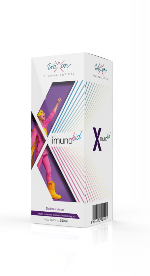X IMUNO KID DOPRINOSI NORMALIZACIJI I JAČANJU IMUNOG SISTEMA KOD DECE, KAO I PRAVILNOM RASTU I RAZVOJU. X-IMMUNO KID sadrži: Spirulinu (Spirulina platensis) Beta glukane (iz Saccharomyces cervisiae), Vitamin C, Vitamin D, Selen, Cink i Jod Namenjen deci uzrasta od 3 godine MOĆNA KOMBINACIJA ZA JAČI IMUNITET Jod i njegov tihi deficit je jedan od najčešće rasprostranjenih poremećaja u svetu, pogotovo jer ga putem ishrane ne unosimo dovoljno u organizam. Iako je otkriven davno i korišćen u terapiji raznih bolesti, vremenom je izgubio na popularnosti. Vraćamo jod nazad u fokus. Izrazito je važan za pravilan rad štitne žlezde i ima brojne funkcije kao antioksidans, suzbija autoimune procese i učestvuje u detoksikaciji. Selen je još jedan element koji ima širok spektar efekata, od antioksidativnih do antiinflamatornih svojstava. Nizak nivo selena povezan je sa povećanim rizikom od smrtnosti, lošom imunološkom funkcijom i padom kognitivnog stanja, dok je veća koncentracija selena ili dodatak selena pokazao antivirusne efekte. Vrlo je bitno da u proizvodima za jačanje imuniteta koji sadrže selen imate i jod jer selen dovodi do povećane potrošnje joda. Vitamin D je liposolubilni vitamin koji doprinosi zdravlju kostiju i zuba i ima ulogu u jačanju imuniteta. Nedavna istraživanja sugerišu da vitamin D igra važnu ulogu modulatora urođenog imunološkog odgovora na respiratorne virusne infekcije, poput gripa A i B, parainfluence 1 i 2 i respiratornog sincicijalnog virusa (RSV). Njegov nedostatak je vrlo evidentan tokom zimskih meseci jer na našem području nema dovoljno ultravioletnih zrakova kako bi se stvorio vitamin D u koži. Cink je esencijalni mikroelement koji ulazi u sastav preko 70 različitih enzimskih sistema (300 enzima ga koriste kao pomažući faktor) u organizmu i doprinosi normalnoj funkciji imunog sistema. Nedostatak cinka povezan je sa povećanom osetljivošću na zarazne bolesti, uključujući virusne infekcije. Apsorpcija je često limitirajuć faktor kad je ovaj mikroelement u pitanju, budući da se iz većine komercijalno dostupnih proizvoda ona kreće od 30-40%. X-Imuno kid sadrži cink citrat koji ima veliku resorpciju i bioraspoloživost. Takođe citrati sprečavaju stvaranje kamena u bubregu i povećavaju stvaranje energije u mitohondrijama. Studija Acevedo-Murillo i sar. među 103 dece (1 mesec – 5 godina) sa upalom pluća pokazalo je statistički značajno kliničko poboljšanje (trajanje bolesti, brzina disanja i zasićenje kiseonikom) u grupi sa dodatkom cinka u poređenju sa placebom. Spirulina ( Spirulina platensis ) je plavozelena alga koja prirodno nastanjuje tropska i subtropska jezera. Ona pokazuje sposobnost modulacije imunološke funkcije i koristi se u terapiji nekoliko bolesti. Bogata je proteinima (70%), vitaminima i mineralima (K, Na, P, Fe, Mg i Ca). Spirulina aktivira limfocite što je bitno za odbranu od virusa i gljivica. Karakteriše je: imunoprotektivno, antivirusno, antioksidativno, hipoholesterolemijsko i glikoregulatorno dejstvo. U studiji „Effect of Spirulina (Candies) Supplementation on Pre-School Children“ deca koja su koristila spirulinu pokazuju napredak u rastu. Imunitet dece se poboljšao, pri čemu nije zapažen nijedan slučaj prehlade i kašlja ni tokom jeseni, ni tokom zime. Beta glukani (iz Saccharomyces cervisiae) su polisaharidi (složeni šećeri) sa beta1,3 i 1,6 glikozidnim vezama izolovani iz kvasca. Upravo ova struktura pokazuje imunomodulatornu aktivnost. Dokazano je da beta-glukani dobijeni iz kvasaca i gljiva, imaju veći biološki uticaj na naš imunitet nego oni dobijeni iz ovsa ili ječma. Stimulacijom imunog sistema beta-glukani doprinose odbrani organizma od različitih bakterijskih, virusnih, gljivičnih i parazitskih infekcija. Oni su veliki molekuli, polisaharidi, koji se ne apsorbuju u organizmu. Kako nešto što se ne apsorbuje može imati bilo kakav efekat? Zato što on aktivira ćelije imunog sistema (leukociti) koje su glavne ćelije za odbranu od infekcija. Studija „Placebo-driven clinical trials of yeast-derived β-(1,3) glucan in children with chronic respiratory problems” pokazala je porast CRP-a i lizozima, a pad albumina u grupama koje su koristile beta glukan. Albumin je indikator inflamacije, jer nivo albumina odgovara stepenu inflamacije mukoze. CRP kao i lizozim čine faktore odbrane pljuvačke, posebno kod imunodeficijentnih pacijenata i dece sklone respiratornim infekcijama. Lizozim ima antimikrobna svojstva, sa sposobnošću da inhibira rast i metabolizam bakterija. Vitamin C je pored svoje uloge u jačanju imuniteta, snažan antioksidans, ostvaruje protektivni efekat na disajne puteve. Pomaže metabolizam proteina i poboljšava apsorpciju kalcijuma, gvožđa i cinka. NAČIN PRIMENE: Deca od 3 do 6 godina 5 ml – 1 kafena kašičica dnevno Deca od 7 do 12 godina 10 ml – 2 kafene kašičice dnevno