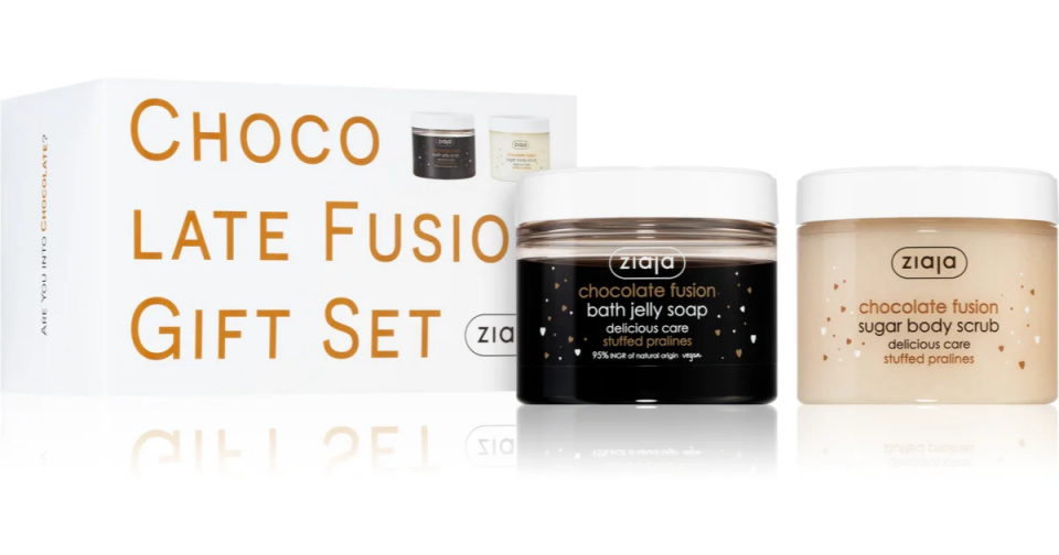 Ziaja Set Čokoladne Praline sadrži: Želatinasta kupka 260ml Šećerni piling 300ml Želatinasta kupka i gel za tuširanje čokoladne praline 260ml Kupka i gel za tuširanje u formi želea, sa mirisom čokoladnih pralina, pruža novo, neverovatno iskustvo prilikom tuširanja. Ostavlja kožu čistom i veoma mirisnom. Namenjena je svim tipovima kože. 95% sastojaka je prirodnog porekla. Način upotrebe: Suvom rukom izvucite željenu količinu želatinaste kupke, stavite u vodu i mešajte dok se ne rastvori i stvori penu. Nežno operite kožu i isperite. Šećerni piling za telo čokoladne praline 300ml Piling za telo sadrži prirodne kristale šećera. Smanjuje suvoću i hrapavost kože. Ostavlja neverovatno mekan trag na koži, bez potrebe za dodatnom negom kože nakon korišćenja Namenjen je svim tipovima kože. Način upotrebe: Nanesite na vlažnu kožu i umasirajte kružnim pokretima. Temeljno isperite. Može se koristiti svakodnevno. Pakovanje: Želatinasta kupka i gel za tuširanje čokoladne praline 260ml 1x i Šećerni piling za telo čokoladne praline 300ml 1x. Zemlja porekla: Poljska